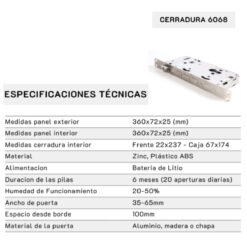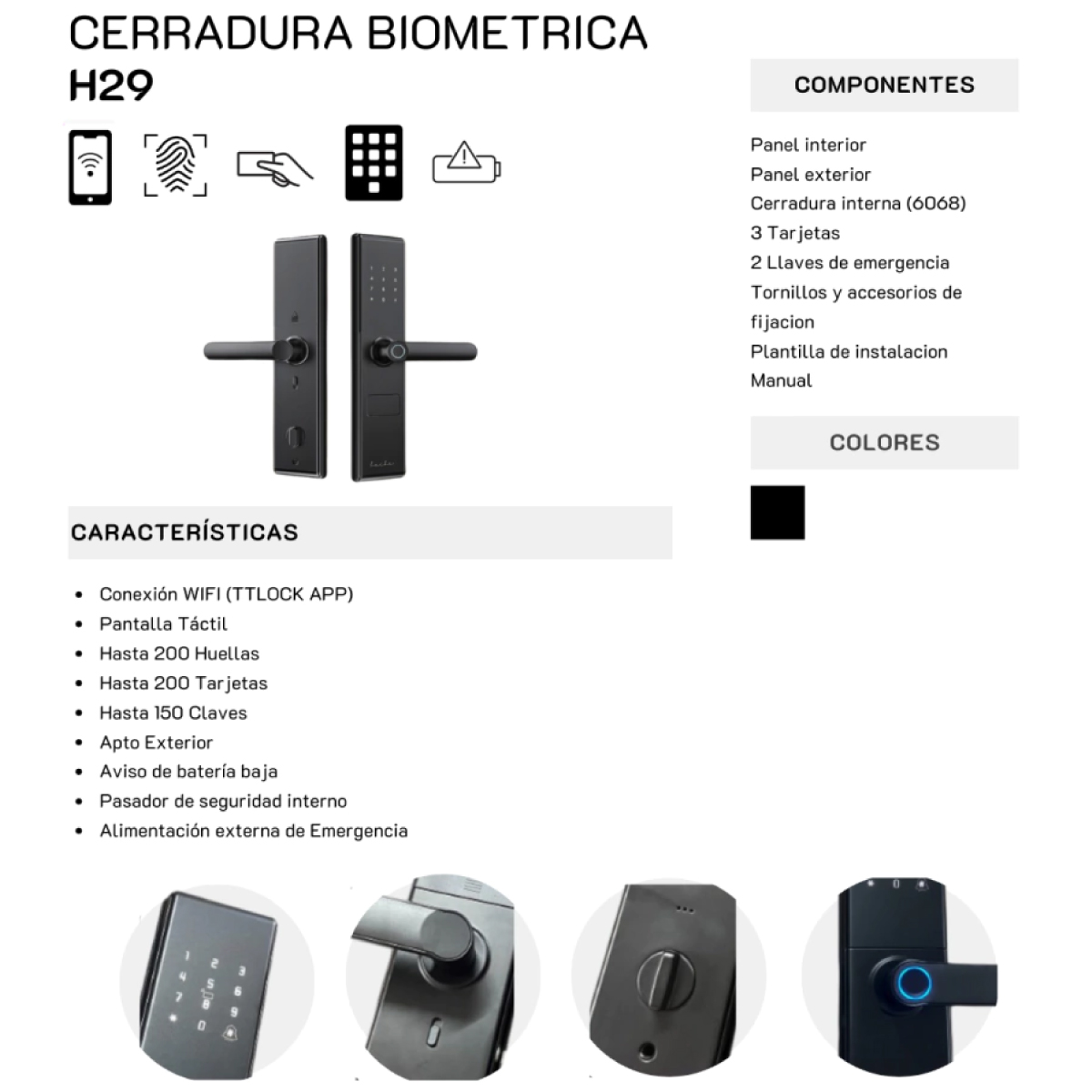 Cerradura biométrica inteligente apertura por Bluetooth, Huella, Tarjeta y Clave, app Ttlock Hache H29. Trabaja mediante WIFI. Tiene apertura mediante huella, tarjeta, código y app TTLOCK. Desde esta última gestionas, a distancia, las diferentes formas de ingreso, donde podes configurar ingresos permanentes, temporales y cíclicos entre otras cosas, y tiene registro de ingresos. Trabaja con 4 pilas AA que tienen una duración de 6 meses aproximadamente con promedio de 20 aperturas diarias. En el caso de quedarse sin pilas tiene apertura con llave de emergencia o por miniusb para enchufarle cargador para una sola apertura.