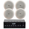 Combo de música funcional ideal para sonido ambiental. Incluye un mini amplificador Senon CA101 con Bluetooth, USB, radio y entradas para micrófono, y 4 parlantes Moon M4PL de tres vías con excelente calidad de audio.
