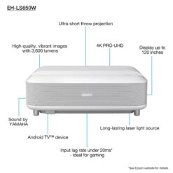 Proyector Láser Ultra Short Throw 4K PRO-UHD Smart Streaming 120″ Epson EpiqVision Ultra LS650. El Proyector Láser Epson EpiqVision Ultra LS650 está diseñado para transformar el entretenimiento del hogar con una experiencia inmersiva de nivel cine. Su tecnología de proyección de alcance ultracorto permite colocarlo muy cerca de la pared y proyectar una imagen gigante de hasta 120 pulgadas, ideal para salas de estar y espacios reducidos.
