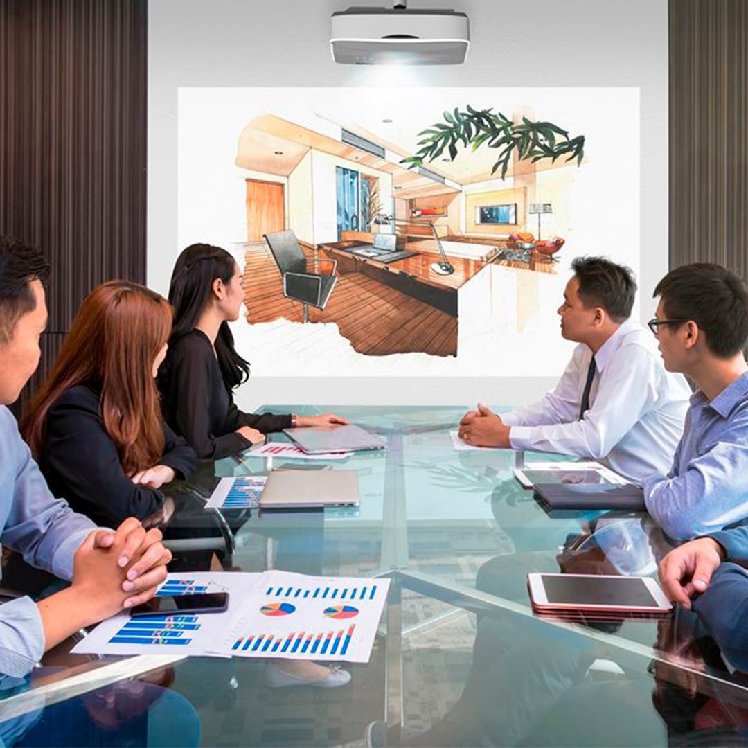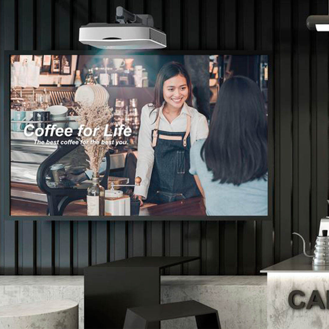 Con una lente de distancia ultra-corta, se puede proyectar una imagen impresionante superior a 100″ desde apenas medio metro de distancia. Esto le permite colocar el proyector cerca de la pared, lo que reduce las sombras para que pueda presentar con facilidad; perfecto para aplicaciones interactivas.