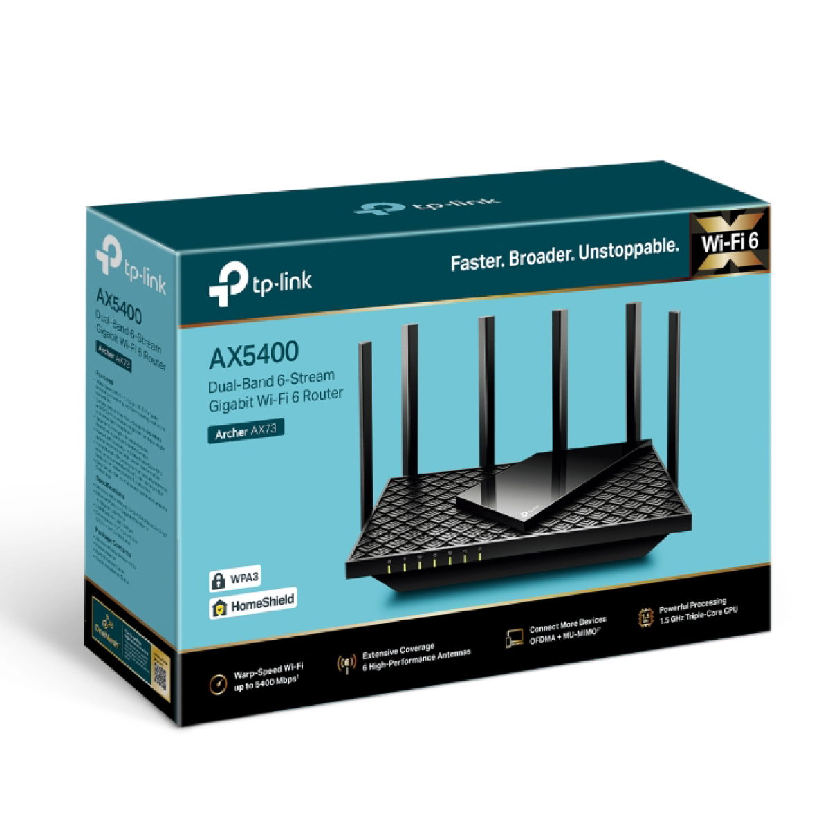 El Archer AX73 es un router Wi-Fi 6 de alto rendimiento diseñado para brindar velocidad, cobertura y estabilidad a hogares y oficinas modernas. Con capacidad de hasta 5400 Mbps, seis antenas de alto poder y tecnología avanzada como Beamforming, OFDMA y MU-MIMO, permite conectar más de 200 dispositivos de manera fluida, ideal para streaming en 8K, gaming y trabajo remoto sin interrupciones. Además, incorpora el sistema de seguridad TP-Link HomeShield para proteger la red y los dispositivos IoT, y compatibilidad con OneMesh para crear una red mallada de cobertura total.